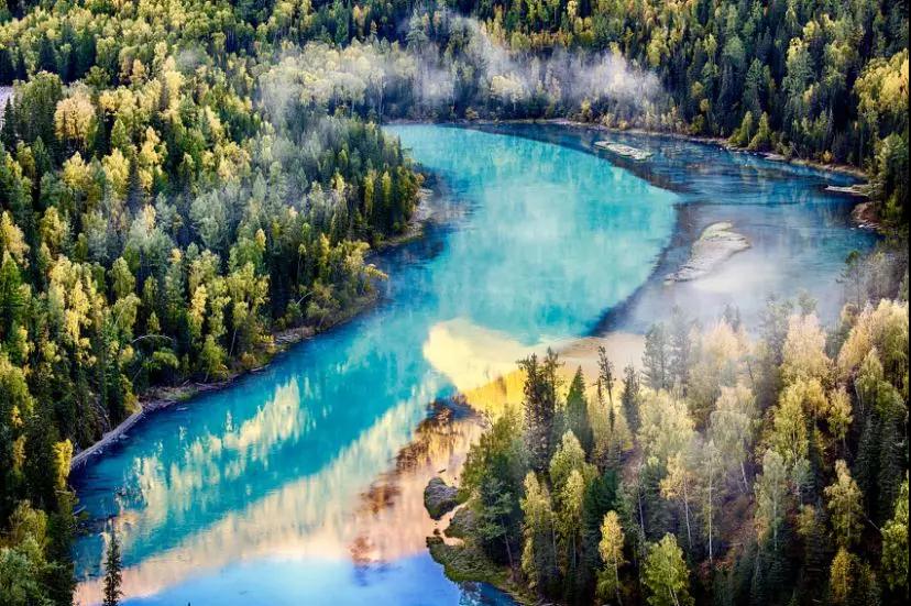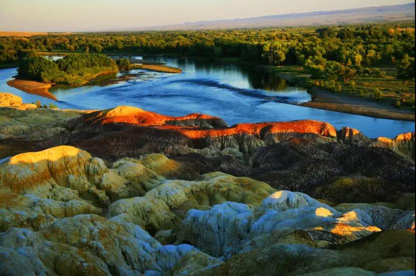 彩色雅丹地貌的五彩滩,额尔齐斯河上古老的牧道桥风光、五彩河岸,边陲小镇布尔津畅饮格瓦斯,美丽迷人的额尔齐斯河夜景。