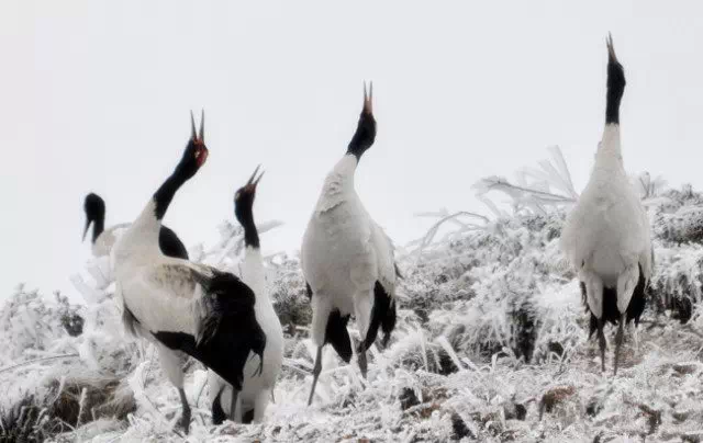 雪原远远地在行走的几个早起的黑颈鹤,只像是几点狭长的黑点,默默地在这块纯白的背景上。