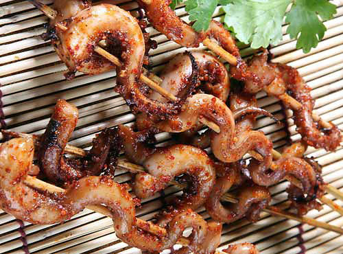 青岛烧鱿鱼的影子随处可见,如想品尝可到当地的王姐烧烤、美达尔、胖姐烧烤、海边人烧烤吧等地,价格不贵,五块钱左右。烧鱿鱼不是真的放到火上烧熟的鱿鱼,准确说鱿鱼是被煎熟的。通常卖烧鱿鱼的摊档里都有一块很大的铁板。