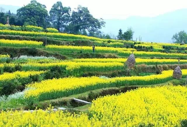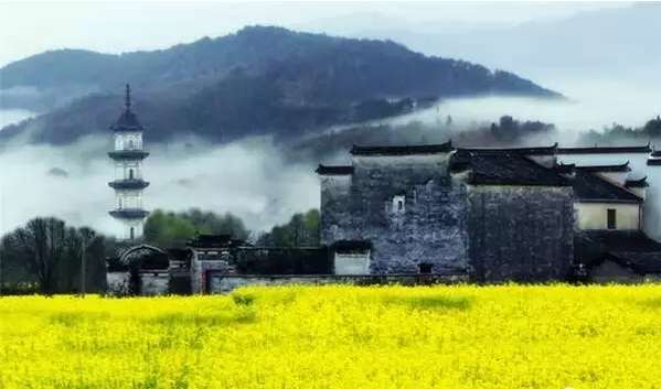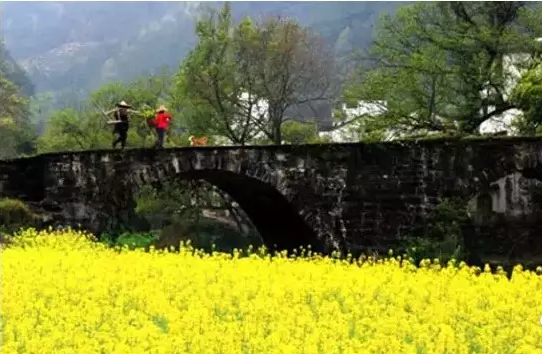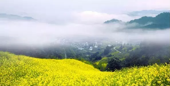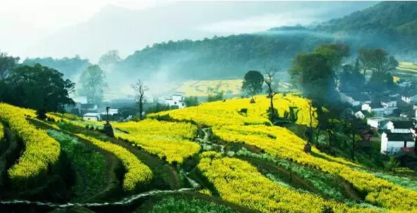 海拔千米,梯田如链似带,黄灿灿的万亩油菜花海与云海雾海、黑白色的徽式民居、洁白梨花、粉红桃花的相融合,随手一拍都是好照片。在山谷中奔泻的金黄色与耕田汉子、浣衣村姑和牧牛稚童,构成一幅幅优美的天然画卷。还有田埂上、花丛中那一座座用稻草做成的塑像,憨态可掬,趣味无穷。