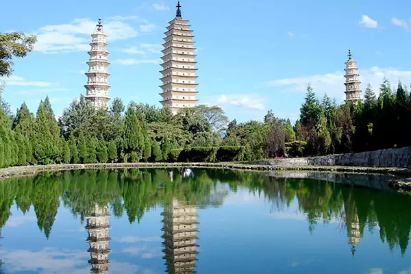 崇圣寺初建于南诏丰佑年间(公元824-859年),大塔先建,南北小塔后建,寺中立塔,故塔以寺名。现寺的壮观庙宇在咸同年间已毁,只有三塔完好地保留下来。崇圣寺以寺中三塔闻名于世,又称“大理三塔”,是中国著名的佛塔之一,三塔由一大二小三座佛塔组成,呈鼎立之态,远远望去,雄浑壮丽,是苍洱胜景之一。