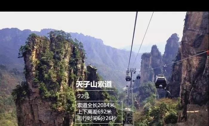 天子山索道| 斜线长2084米,高差692米,有着“中国十佳旅游索道”美誉。单程:72元/人。