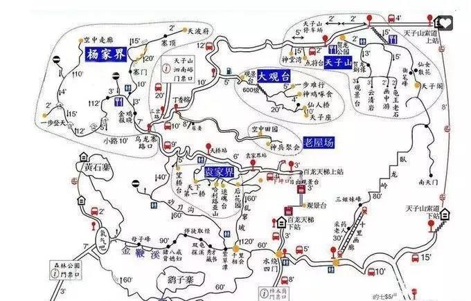 森林公园门票站——金鞭溪——杨家界索道——杨家界景区——天子山门票站(夜宿)