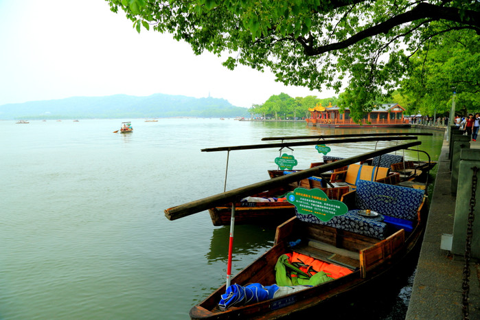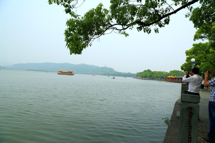 经过两个多小时的颠簸,西湖美景终于映入眼帘。车子沿着湖边驶向苏堤,湖面上泛着游船,堤上密密麻麻的人群,太阳照射之下,青波碧水,让人心旷神怡。