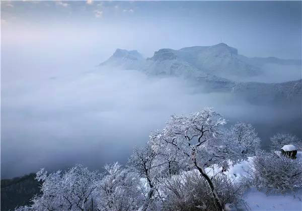 云台山被笼罩在茫茫白雪中,形成雪松冰挂奇特美景。松树换上雪裳,叶子凝固在冰晶之下,剔透如琥珀……披着雾凇的树木恬然静立,晶莹的冰羽则在周围轻轻旋动,让白色的剪影时隐时现。如此飘逸优雅,又如此轻盈易碎,似乎不属于这个世界。