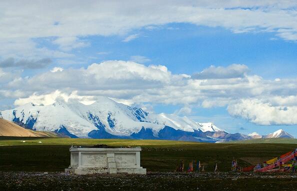 阿尼玛卿大藏文书中意为活佛座前的最高侍者,“阿尼”是安多藏语的译音,意为先祖老翁,也含有美丽、幸福或博大无畏等意;“玛卿”的意思是黄河源头最大的山,也有雄伟壮观之意。阿尼玛卿雪山,是位于果洛州大武镇附近的古老山脉,她散发着神秘和不可征服的气质。她是青海众山之首,藏区四大神山之一,是这方水土最大的山神。在下大武到雪山的碎石公路上,有个最好的观景台,从那里看阿尼玛卿的主峰,仿佛伸手可触。在这里,你常常会碰见转山的人,有些是游客,更多的是当地人,他们与这座雄伟的雪山一起,勾绘出果洛最令人难忘的画面。