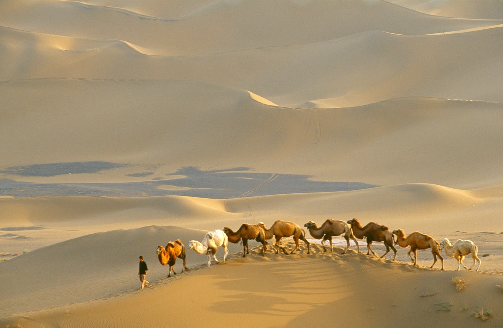 新疆吐鲁番,晨曦中,新疆库木塔格沙漠风景区栩栩如生的“骆驼”在沙海中跋涉。浩瀚的库木塔格沙漠被温暖的阳光唤醒,经过风的洗礼和大自然的雕琢,在天地间显现出一种令人神往的韵味。