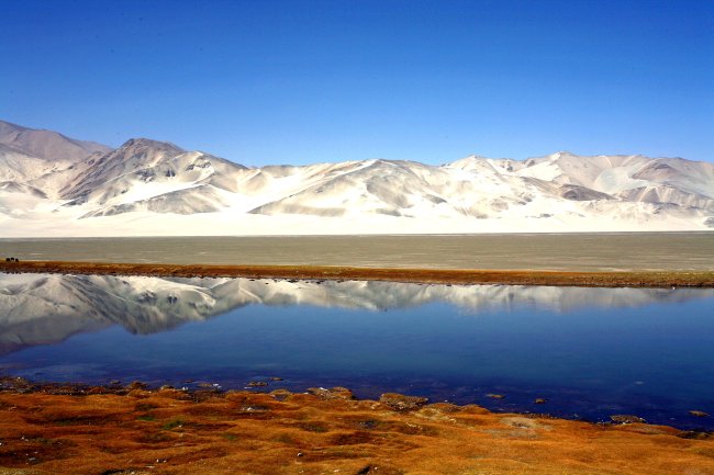 白沙湖位于新疆克孜勒苏柯尔克孜自治州阿克陶县布伦口乡。滚滚沙山环抱一泓碧水,湖面平滑如镜,湖中莲花朵朵,芦苇摇曳,掷石子于水中,鸬啼凫飞,热闹异常,湖边桦挺杨秀,花妍草青,如在空中俯视,宛若宝镜镶翠.