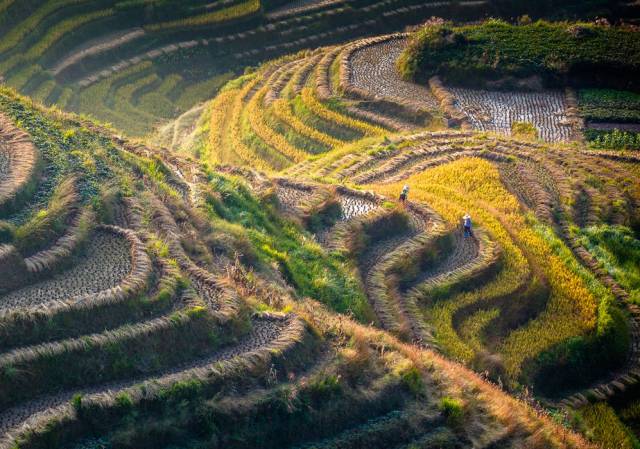 龙胜梯田一层层从山脚盘绕到山顶,层层叠叠,高低错落。其线条行云流水,其规模磅礴壮观。