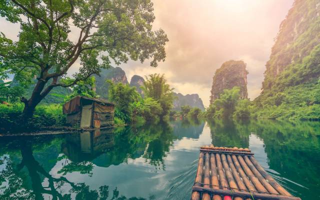 和风吹拂中的漓江,流云漫漫,阳光明媚,风中摇曳的茸茸灌木和小花,远远看去,若美女身上的衣衫,晴朗天候,上下天光,一碧万顷,千峦百蟑,尽人眼帘。