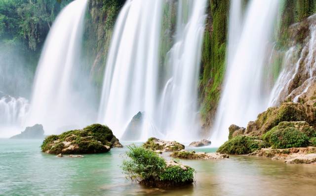 德天大瀑布横跨中国、越南两个国家,是亚洲第一、世界第二大的跨国瀑布。它起源于广西靖西县归春河,终年有水,流入越南又流回广西,经过大新县德天村处遇断崖跌落而成瀑布。