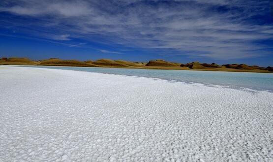 坐着小火车深入湖心,沿途可以欣赏天空湛蓝透彻,盐湖洁白无瑕。在这里,与时光和天空对坐,明澈,宁静。