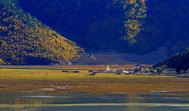 秋冬来临,草原一片金黄,而背面皑皑白雪的辛雅拉雪山山峰倒影于湖泊之中,黑颈鹤、黄鸭、斑头雁在草丛中、水面上嬉戏,更是为空灵的草原带来了生机。