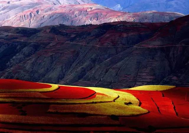 每年9至12月,一部分红土地翻根待种,另一部分红土地已经种上绿绿的青稞或小麦和其他农作物,远远看去,就像上天涂抹的色块,艳丽非常。