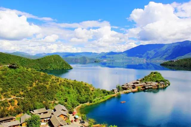 海岛左右青山环抱,傍立格姆女神,相传湖水是女神的泪水,景色千变万化,奥妙无穷。