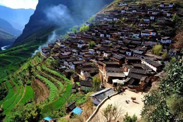 三面皆是悬崖绝壁,村寨依山而建,耸立于金沙江峡谷的陡峭山坡上,雄峙四周。