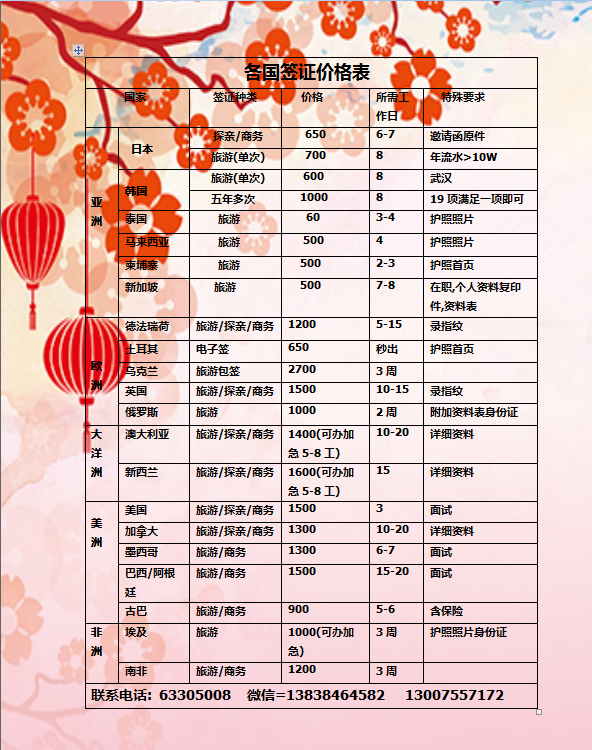 更多亚洲,非洲,澳洲,美洲,欧洲签证敬请来电或微信咨询!