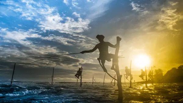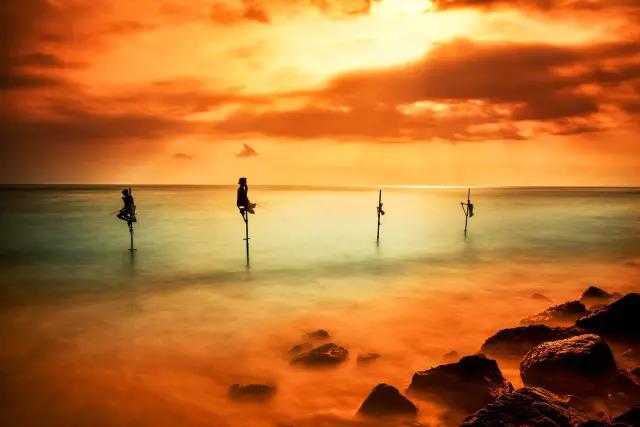 在斯里兰卡,Galle附近的koggala一带浅海沿岸,祖祖辈辈都采用这种独特的捕鱼方式,曾经渔夫们穷得买不起船,就发明了踩着高跷捕鱼的方法,分分钟就能钓上不少鱼。
