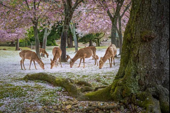 传说春日大社的神祗就是骑着一头白鹿来到奈良,所以鹿被视作神的使者受到严密的保护,走进林中,邂逅小鹿、行人,诉说浪漫的神话。