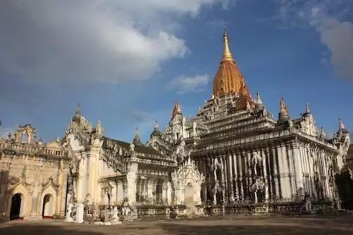 最美—阿南达寺 阿南达寺(Ananda Temple)——蒲甘现存最完整、造型最美丽的佛教寺庙,其建筑工艺大大超越了之前的佛塔,而且建造时融入了缅甸特有的风格。阿南达佛塔为圆形,通体贴满金箔,并镶嵌着无数光彩夺目的珠宝。塔的底座是四方佛窟,主塔的周围环绕着小塔、佛像和各种雕像,整座塔工艺湛,繁而有序,集缅甸古代建筑艺术之精华。 最高—达宾纽寺 达宾纽寺(Thatbyinnyu Pahto)位于阿南达寺西南边不到800米处,是所有佛塔里最高的,也是蒲甘最早的楼中楼型建筑之一,它与阿南达寺并称为“蒲甘双塔”。作为蒲甘第二佛塔,达宾纽寺内有一座巨大的砖砌佛像,塔壁有巴利文长颂石刻。这里曾经是最好的观看日出日落的地点,但现在为了保护建筑,游客已经不能再上去,只能在第一层观赏。 最完整—达玛扬基寺 达玛扬基寺(Dhammayangyi Temple)是蒲甘最雄伟的佛塔,在蒲甘任何地方都可以望到它砖红色的塔身。佛塔的拱门环环相扣,回廊里的窗户透进自然光线,照亮内部。由于国王在未完工时就被刺杀,导致达玛扬基寺的塔顶至今没有修建,后人觉得此塔有不祥之兆便把它叫做“厄运塔”。但也正因为没有塔顶,所以它在外形上有别于蒲甘的其他众多佛塔。